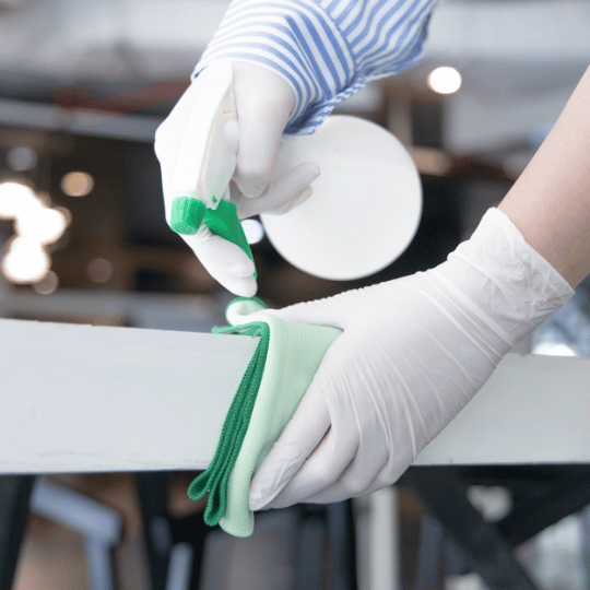 - Manual disinfection of high-touch zones like switches, doorknobs, remotes, and desks